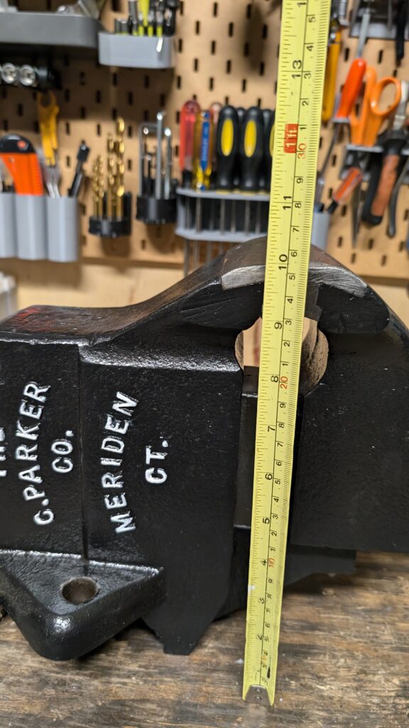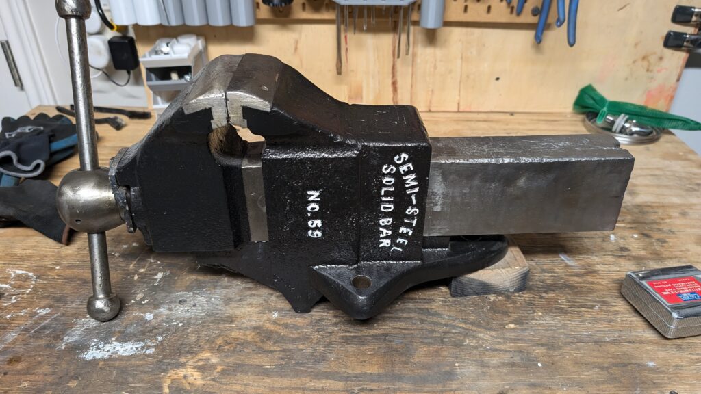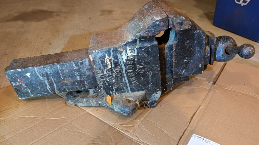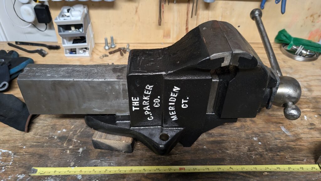This post will cover the teardown and restore of this well-loved Parker No. 59 vise. This model showed up in catalogues around 1912, and according to the 1912 catalogue, the vise is 81lbs with 4 3/4″ jaws and was available then for $11.75, which is equivalent to about $400 in 2026. This particular vise does not have the patent date on it, meaning it was made at least 17 years later, so sometime around 1930 – this makes it just under 100 years old!